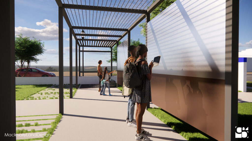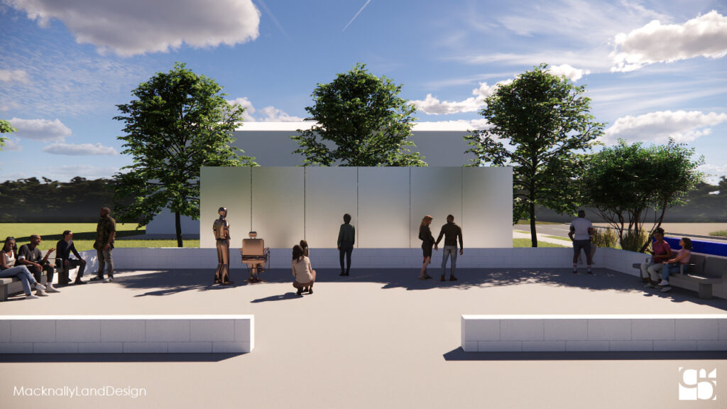 The walls framing the space establish the footprint of the former building. Interpretive signage and a reflection wall, a collaboration with Alabama artist Caleb O’Conner, tell the stories of key figures and events in Tuscaloosa’s civil rights history.